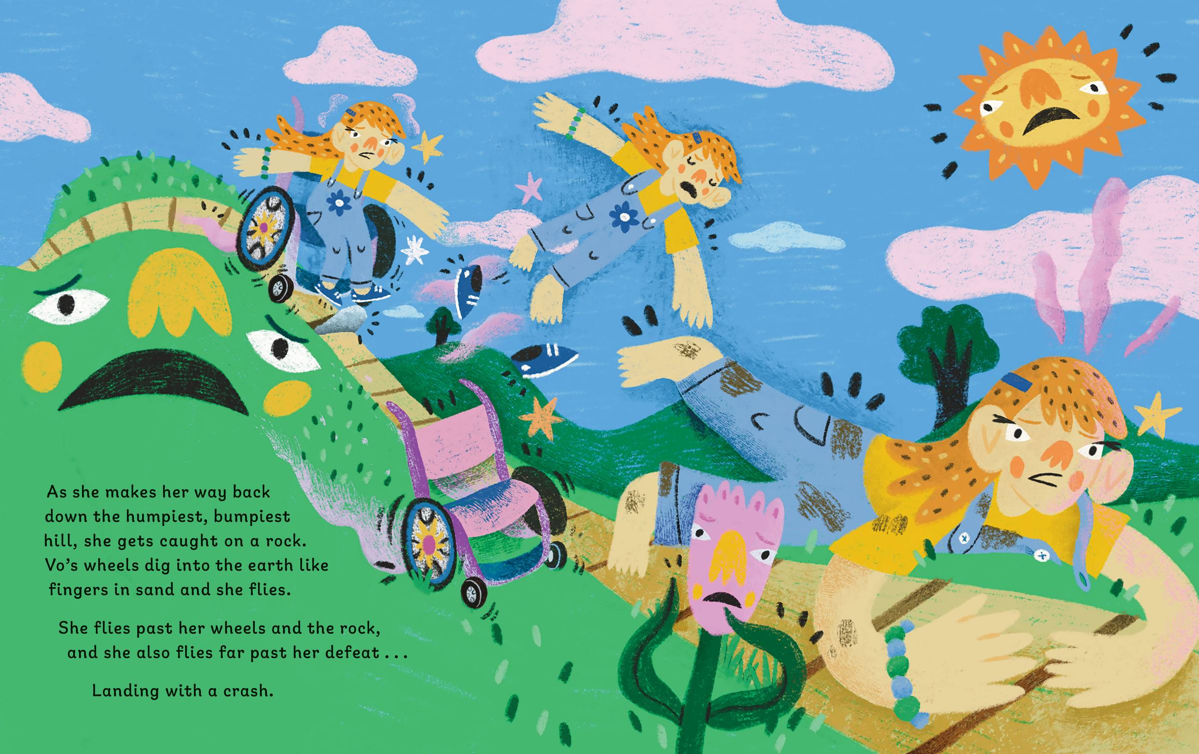A continuous illustration to show the full spread of the book. You see Vo falling from her wheelchair from a paved path on a large hill, where there’s a rock obstructing the path. The spread shows varying stages of her fall as she leaps into the sky, and plants onto the ground looking distressed as her wheelchair tumbles away from her. The hill has a face on it, looking distressed. A flower character and the sun also look distressed, as does Vo who’s landed on the ground with dirt all over her. “As she makes her way back down the humpiest, bumpiest hill, she gets caught on a rock. Vo's wheels dig into the earth like fingers in sand and she flies. She flies past her wheels and the rock, and she also flies far past her defeat... Landing with a crash,” is typed on the hill.