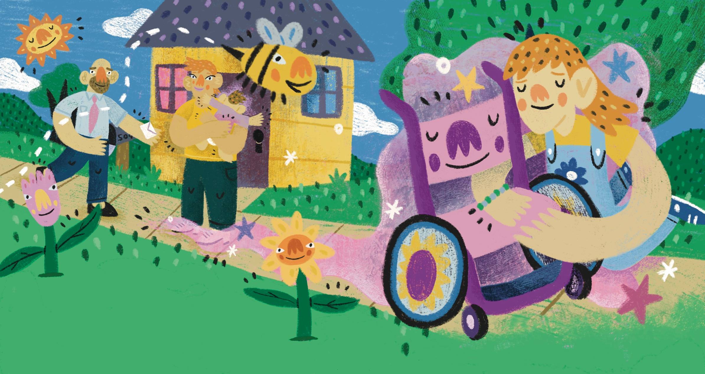 Another spread, showing Vo's parents, a white bald man with a brown beard carrying a piece of mail wearing a collared shirt, blue pants, black shoes and a pink tie, and a white woman with red hair wearing a yellow shirt, dark teal pants and white shoes carrying a small baby with brown hair, a pink shirt & diapers, looking at Vo embracing her wheelchair who has facial features. A bee is buzzing around as two flowers in the ground look at Vo along with the sun, who is smiling down on everyone.